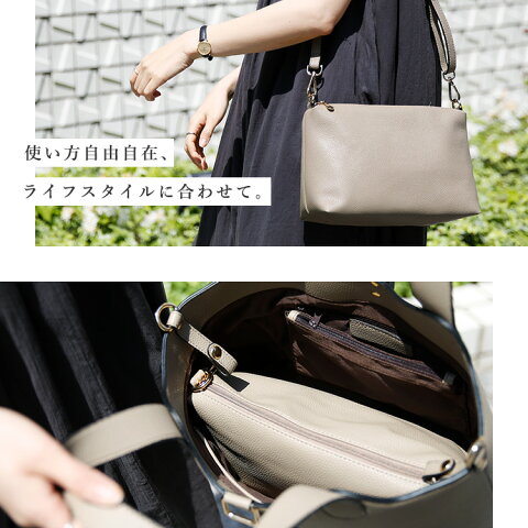 A4サイズが入るサイズ感に、ショルダーベルトで 斜め掛けが可能なのもうれしいポイント!同じ素材でできたインナー バッグは付属のショルダーベルトでポシェットとしても使えます。